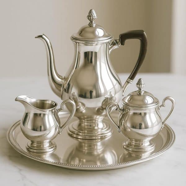 Серебряный кофейник может стать центральным акцентом на столе, особенно если его форма перекликается с другими предметами сервировки — чашками, подносом, сахарницей.