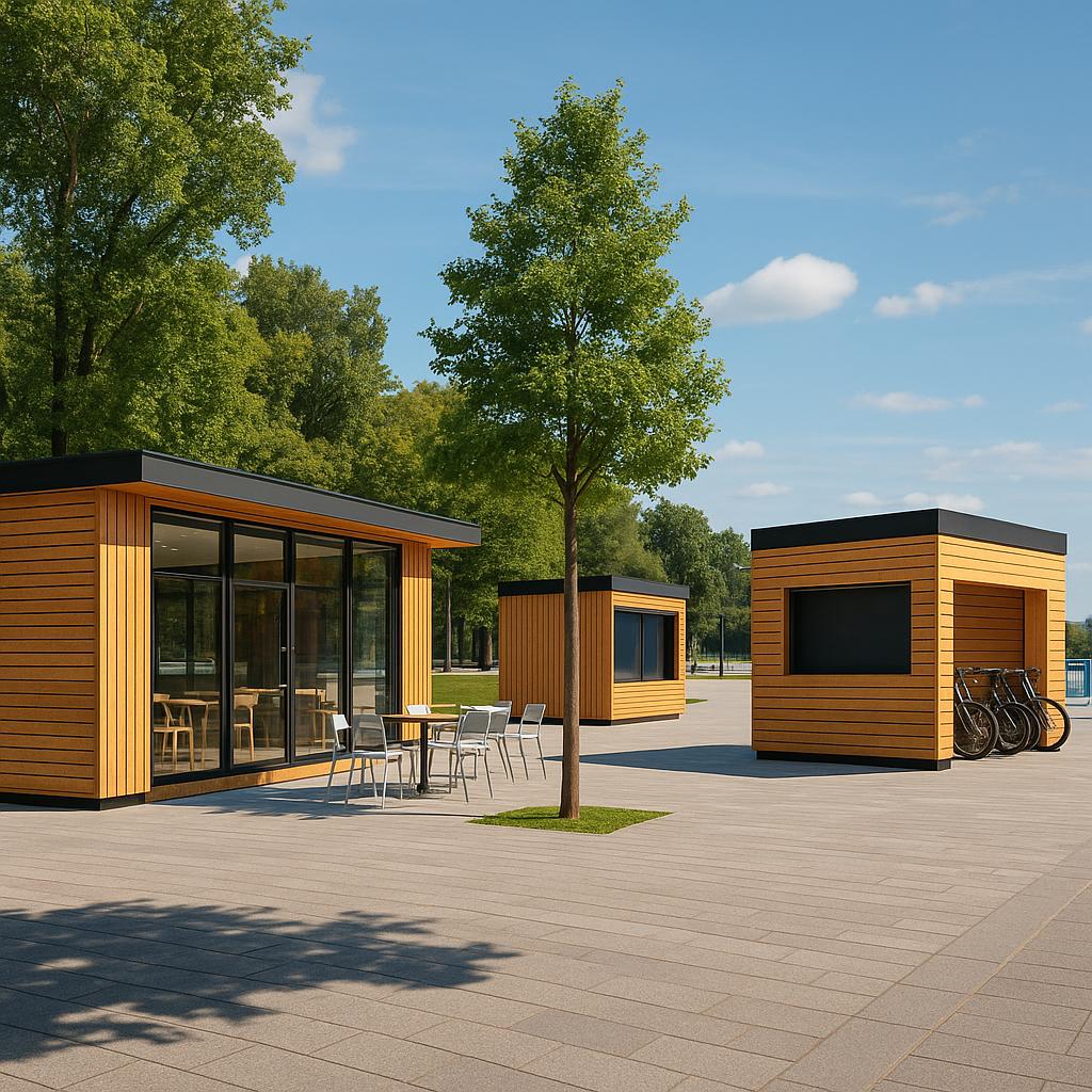 Модульные торговые точки помогают поддерживать коммерческую активность в парках, не нарушая общий стиль. За счёт типовых решений можно создать целую галерею одинаковых павильонов, где каждый предприниматель арендует свой блок — это гармонично и организованно.