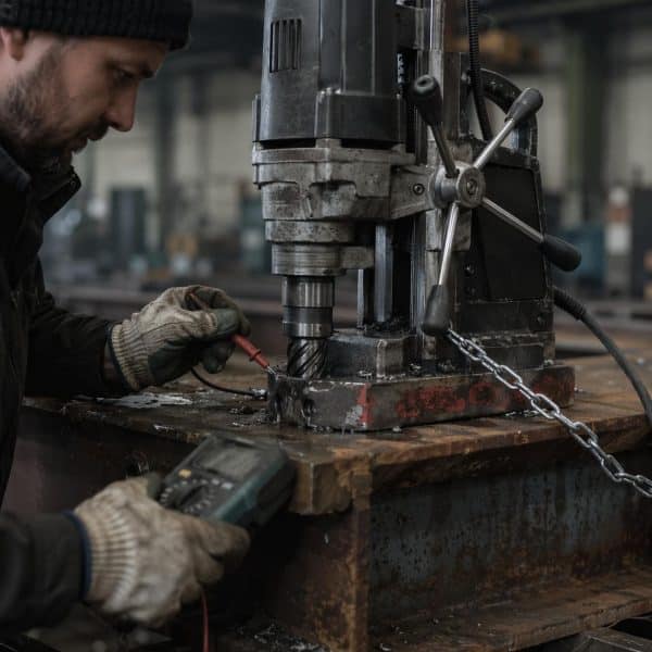 Штатный предохранитель цепи управления (обычно номиналом 2А или 3А) подвержен термической усталости. При систематической работе на пониженном напряжении сила тока компенсаторно возрастает, что ведет к деградации плавкой вставки. Базовое правило инженера при аудите магнитных сверлильных станков: замер вольтажа сети производится мультиметром строго в момент пиковой нагрузки (нажатие кнопки пуска ротора), а не на холостом ходу. Игнорирование этого протокола приводит к ложным выводам о неисправности самой электромагнитной базы.