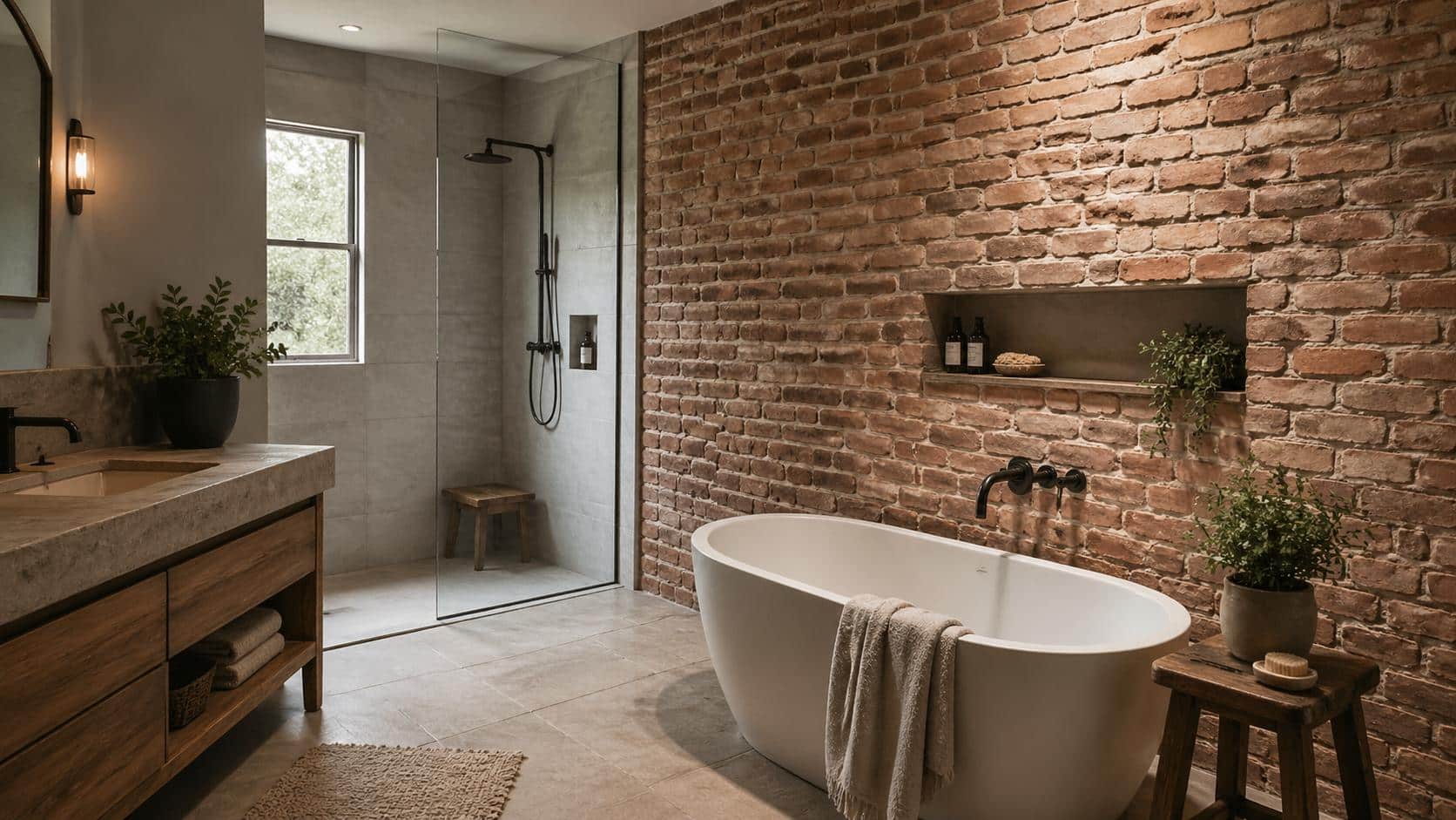 Гипсовая имитация — декоративные панели под кирпич. Вариант только для сухих зон: стена напротив ванны, ниша под зеркало. Прямого контакта с водой гипс не выдержит.