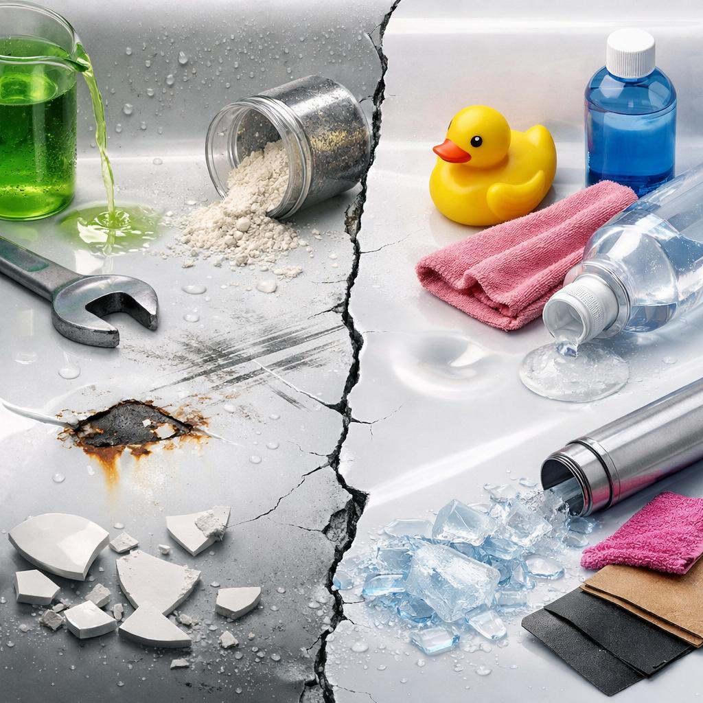 Главное правило для акрила: запрет на любые абразивы. Даже мелкий порошок мгновенно оставляет на полимере сеть царапин. Также акрил плохо переносит щелочные средства высокой концентрации. Для очистки подходят только специализированные составы для акриловых ванн или обычное жидкое мыло.